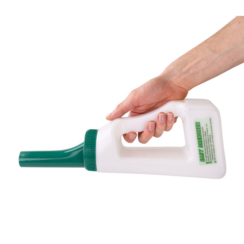 Warning. If you still use an old wine bottle for drenching cows for bloat etc, you'd better watch out for the OSH man! Glass bottles are dangerous to both man and beast. Easy Drencher is the answer. Developed by New Zealand dairy farmer Kevin Bills. A purpose-designed all-plastic bottle for safe and easy administration of volume drenches. Easy Drencher features: - easy-grip handle, 1.2 litre capacity marked in 100ml levels, 12cm long safe plastic probe, wide 63mm neck opening for ease of filling with dry or liquid remedies. Note: Even though this device has been designed with safety in mind, care must still be taken to allow the animal to adequately swallow during drenching. Drowning can occur. Administer in the side of mouth for correct probe placement.